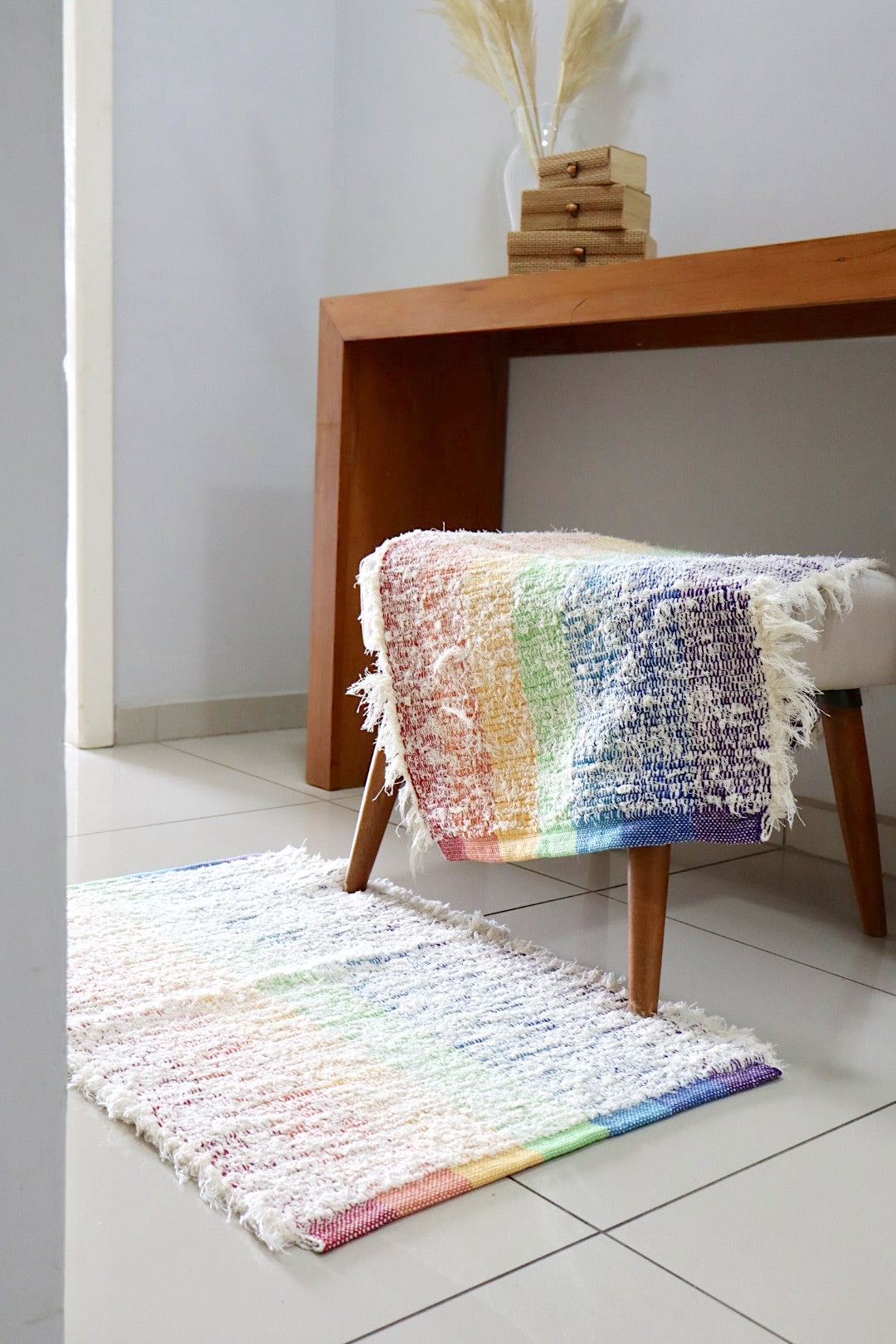Além do ar de conforto que trazem para o ambiente, protegem o piso e delimitam espaços. Confeccionados à mão em Algodão, nossa linha de tapetes irá trazer diversas vantagens na sua rotina do dia a dia.