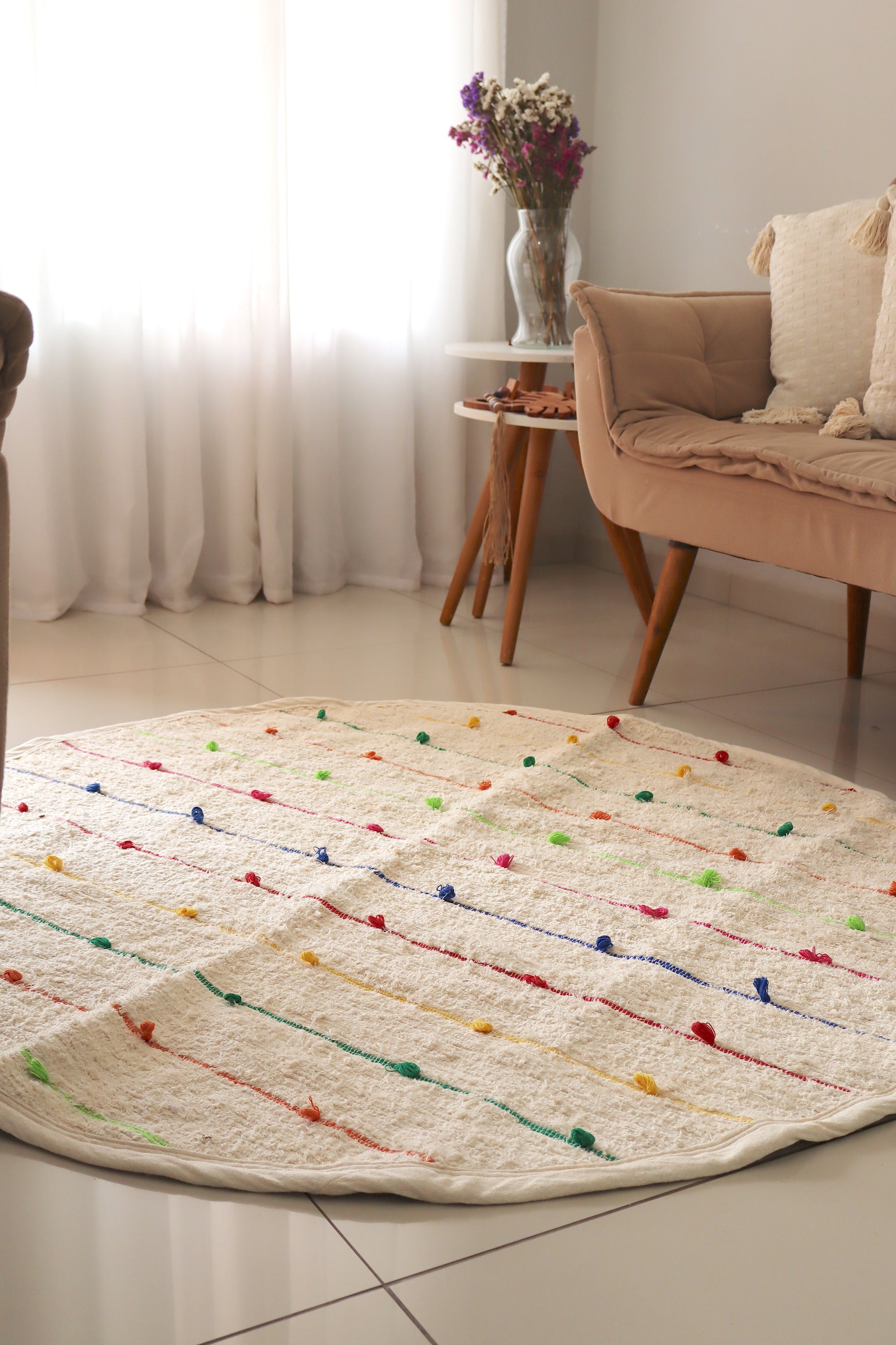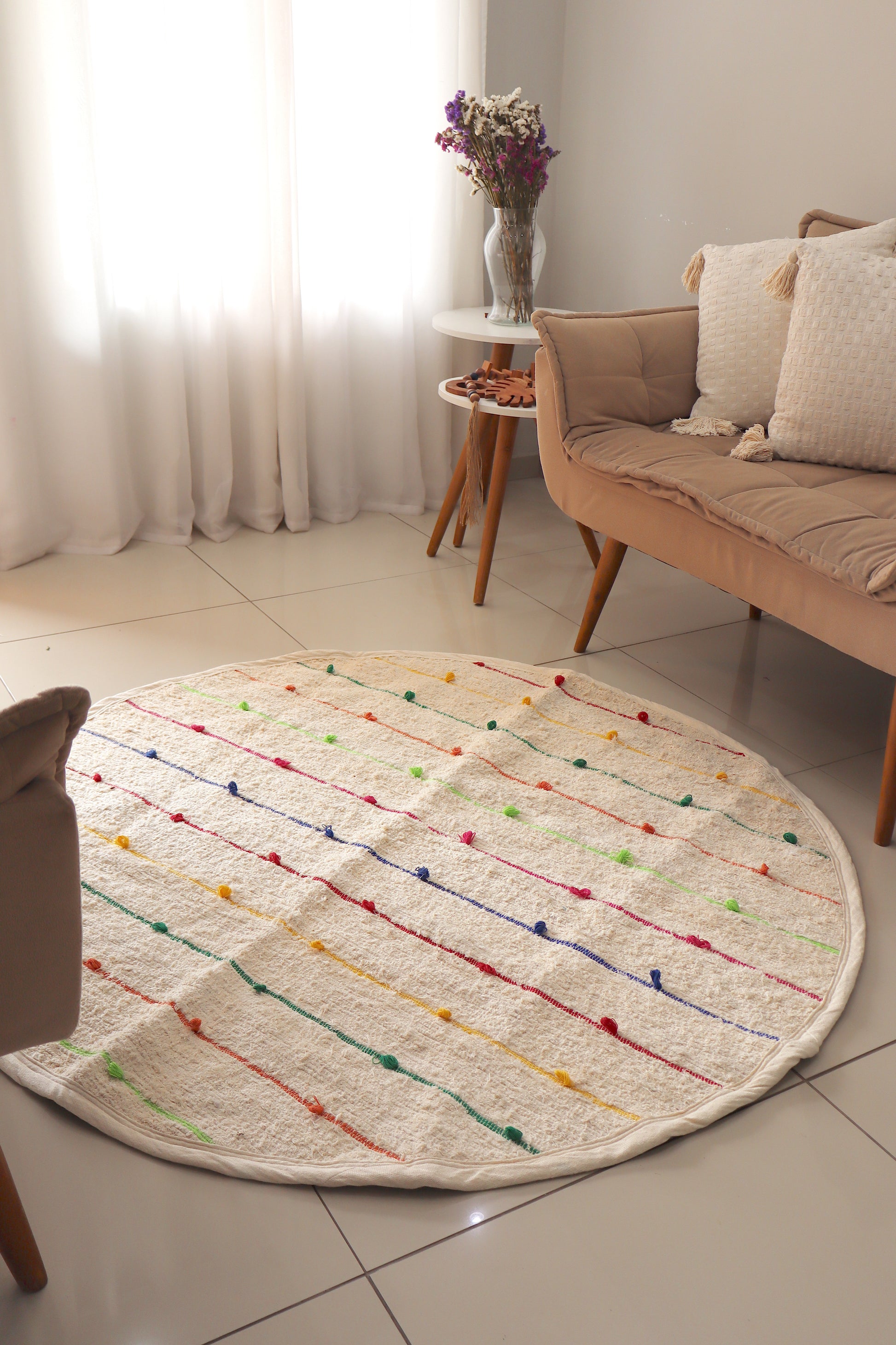 Tapete Algodão Puxadinho Redondo Pompom Colorido Arco Íris 2,0m