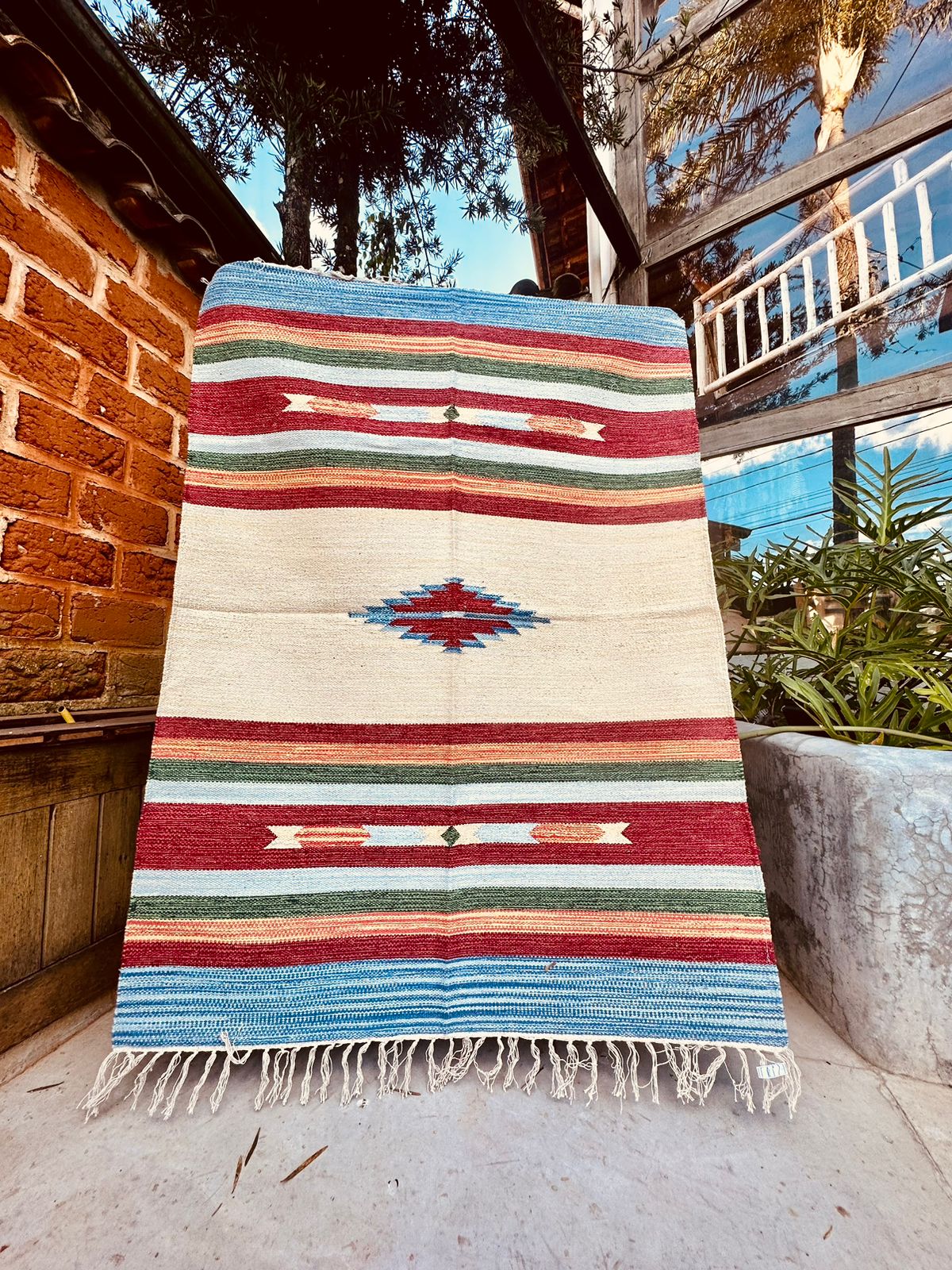 Adquira agora o Tapete Kilim Indiano para transformar sua sala em um espaço encantador e cheio de personalidade.