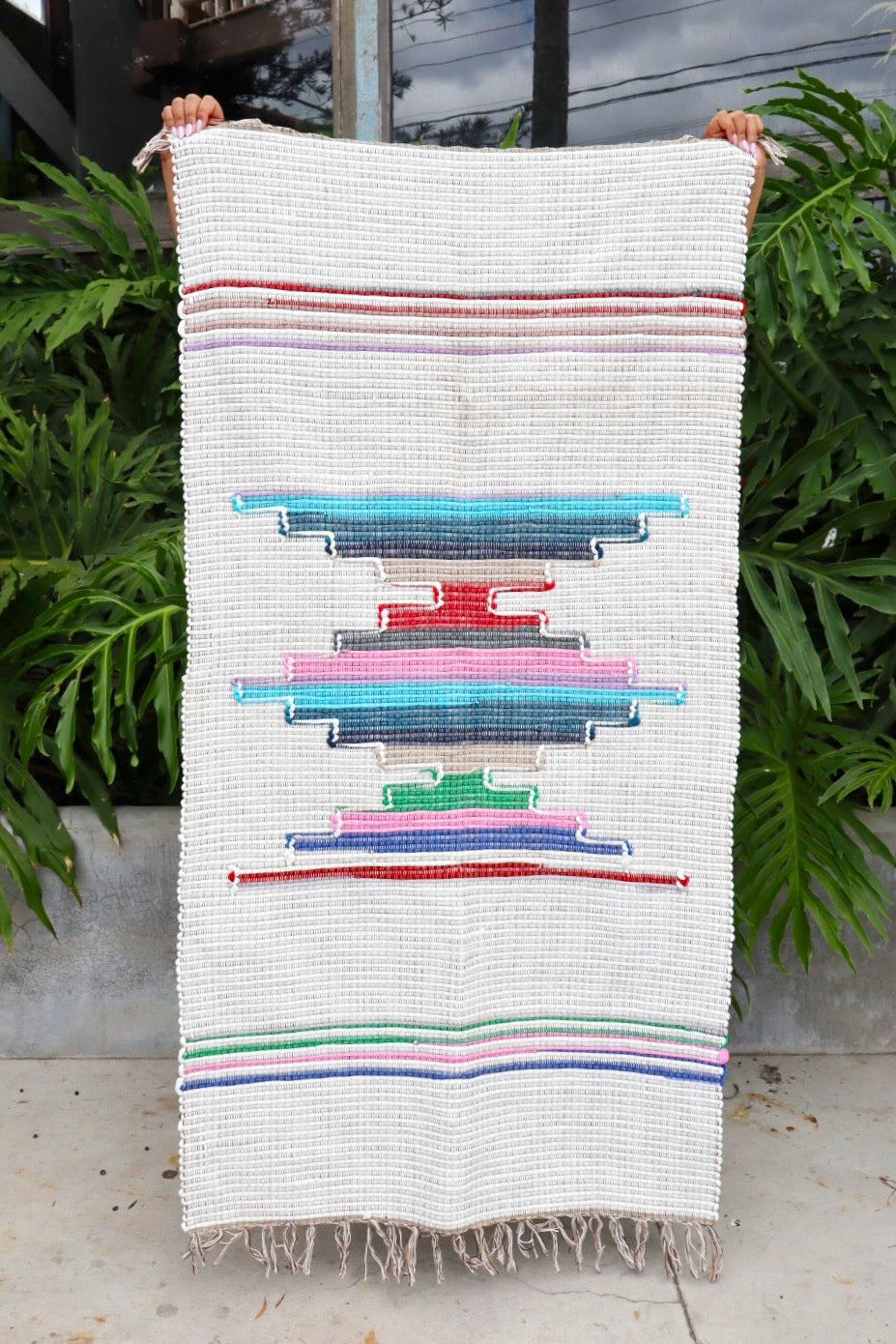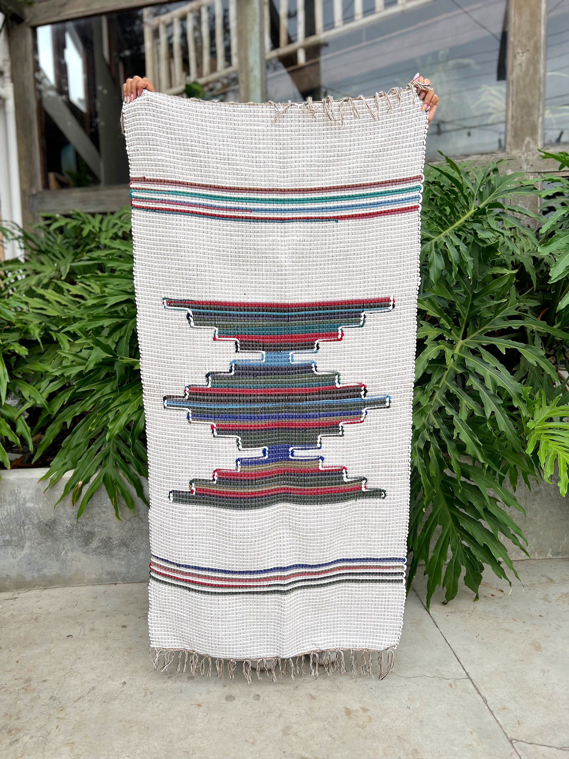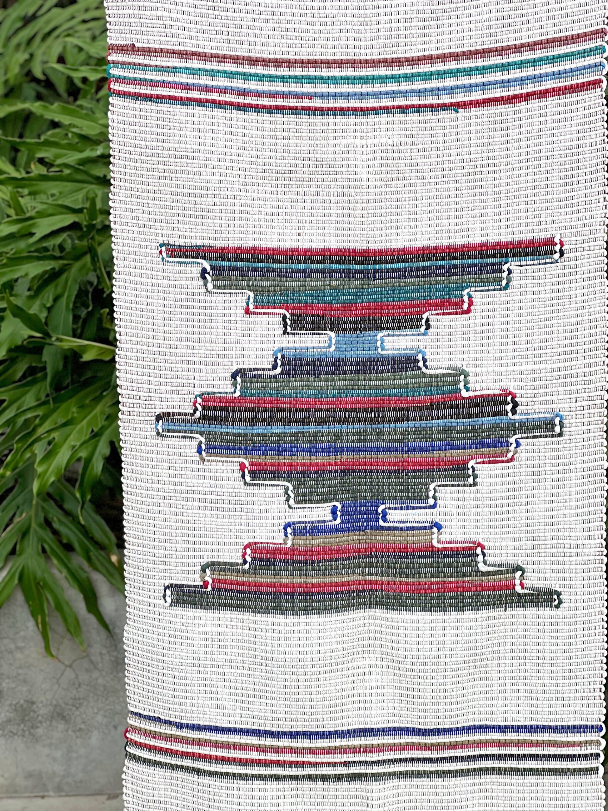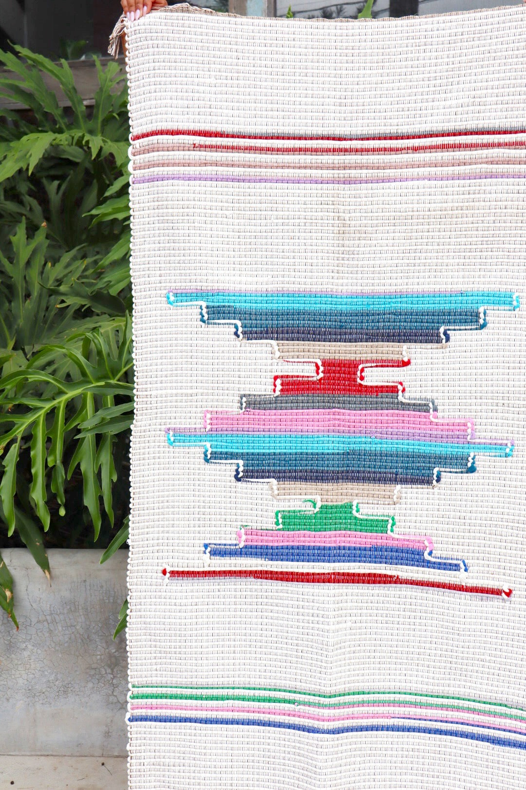 O tapete sofre pequenas alterações na ordem e também tonalidade das cores por se tratar de uma peça manual, nada que altere a originalidade da peça. Se mantendo igual o desenho geométrico, as listras sempre tem variações.