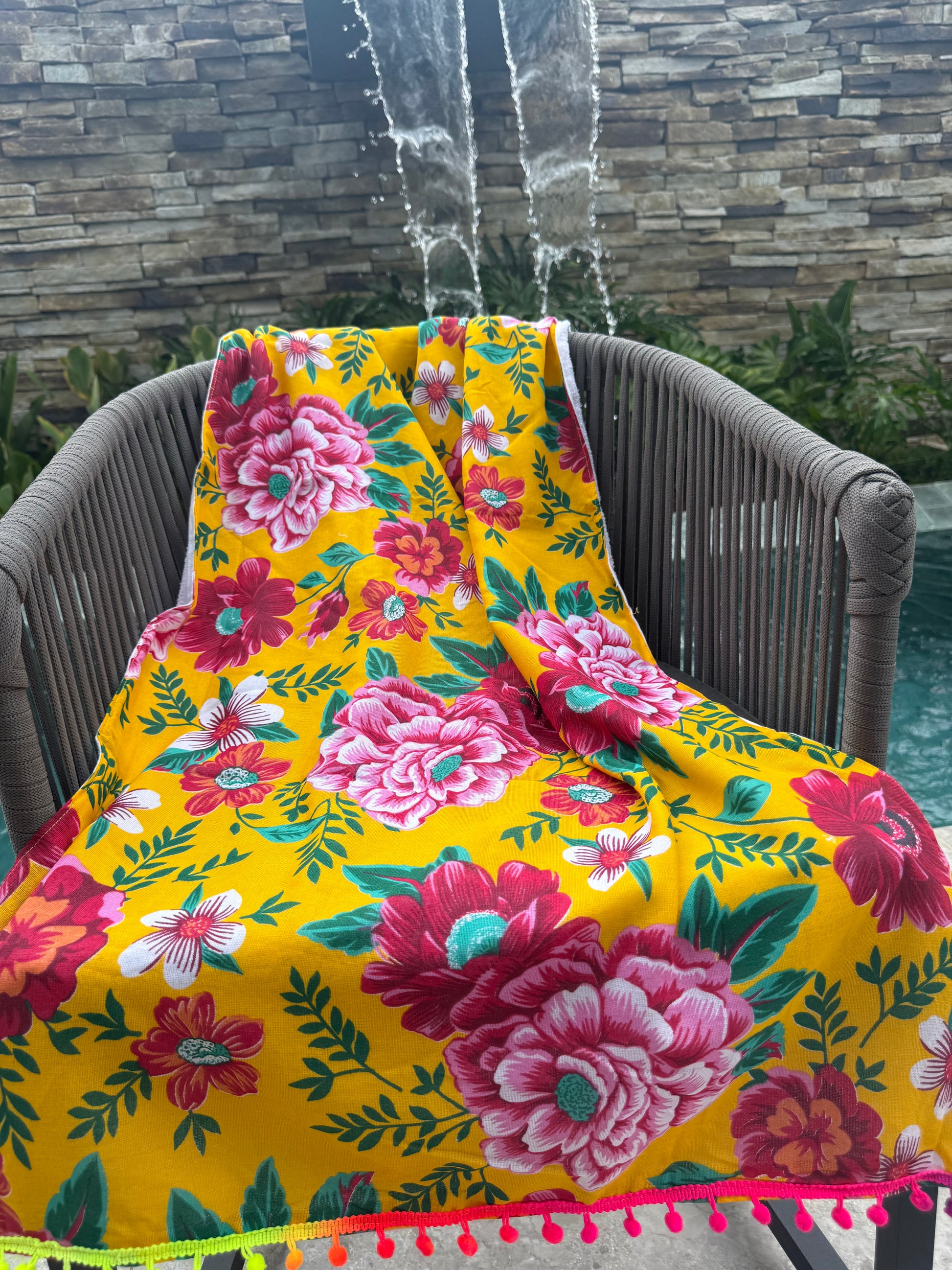 A canga feminina é confeccionada em chita com estampas florais, acrescentando toque macio e confortável. Possui textura atoalhada e barra de pompom colorido.